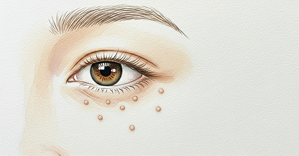 目の周囲に白や褐色のブツブツの突起ができます。汗が出る汗管の細胞が増殖してできる良性腫瘍で、炭酸ガスレーザーによる治療を行いますが、数年で再発する場合があります。