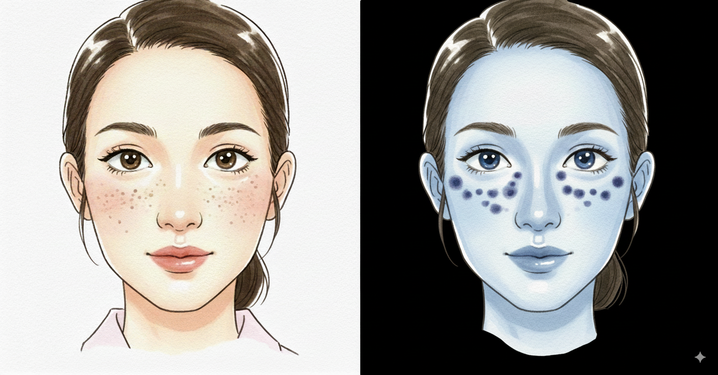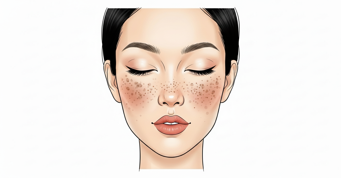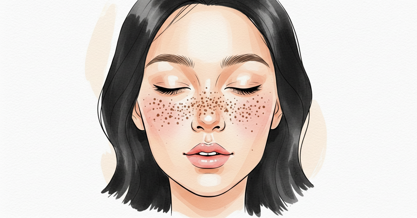 1~数ミリの茶色の褐色斑で、頬や下眼瞼、鼻の範囲にかけて広がるそばかすは、老人性色素斑と異なり遺伝的な要因が大きく、幼少期から発症します。そばかすは、顔以外に肩、背中、手、デコルテにもできる場合があります。紫外線によるダメージで、そばかすの色が濃くなります。
